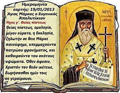 Ο Ιερός Ναός Αγίου Μάρκου Ευγενικού Κάτω Πατησίων (Αλεξ. Παπαναστασίου 48, πλησίον σταθμού ΗΣΑΠ , στάση ΑΓΙΟΣ ΝΙΚΟΛΑΟΣ) ΤΗΛ. 210-8310629, θα τιμήσει τον Μέγα Στύλο και Υπέρμαχο της Ορθοδοξίας, Άγιο Μάρκο Ευγενικόν, ως ακολούθως.