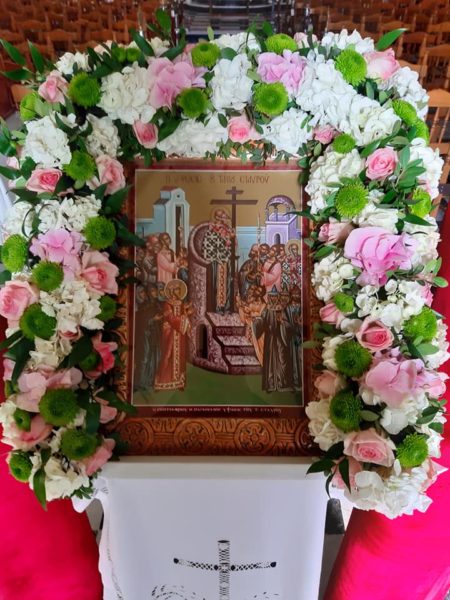 Η ιερά εικόνα της εορτής επίσης καταλάμπουσα και στολισμένη στα άνθη.
