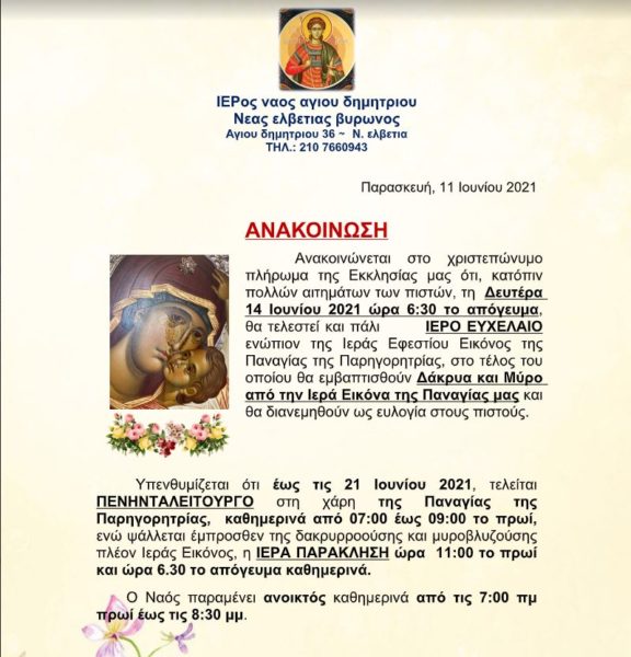 Συνεχίζεται η διάθεση του Μύρου της Παναγίας της Παρηγορητρίας στους πιστούς από τον Ιερό Ναό του Αγίου Δημητρίου Νέας Ελβετίας Βύρωνος. Συγκεκριμένα τη Δευτέρα 14 Ιουνίου θα τελεστεί το Ιερό Ευχέλαιο στις 18:30 όπου θα εμβαπτισθούν Δάκρυα και Μύρο από την Ιερά Εικόνα της Παναγίας και θα διανεμηθούν στους πιστούς.