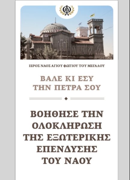 Ο Ιερός Ναός του Αγίου Φωτίου του Μεγάλου της Ιεράς Μητροπόλεως Θεσσαλονίκης διοργανώνει τη δράση “Βάλε και εσύ μια πέτρα, Γίνε και εσύ ο Κτήτορας του Ιερού μας Ναού” ώστε να συγκεντρώσει το ποσό για την εξωτερική επένδυση του Ναού από πέτρα στο βόρειο τμήμα καθώς υπάρχει ανάγκη αποπληρωμής του χρέους.