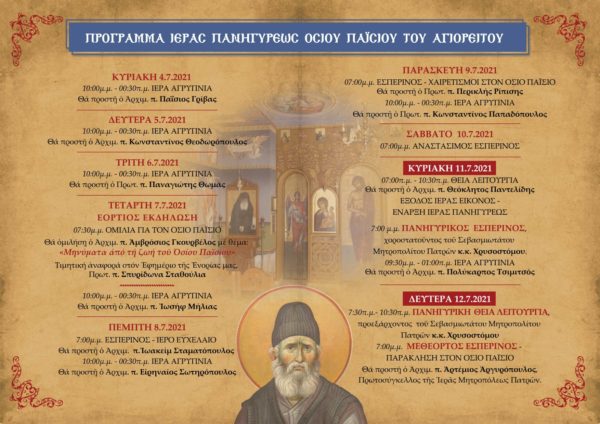 Την Πέμπτη 8/7/2021 τελέστηκε η Ακολουθία του Ιερού Ευχελαίου από τον Αρχιμ. π. Ιωακείμ Σταματόπουλο και ακολούθως Ιερά Αγρυπνία, ενώ την Παρασκευή 9/7/2021 εψάλη ο Εσπερινός και η Ακολουθία των Χαιρετισμών του Οσίου Παϊσίου του Αγιορείτου. Προέστη ο Πρωτ. π. Περικλής Ρίπισης.
