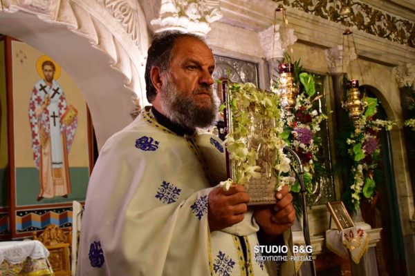 Φέτος τον πανηγυρικό Εσπερινό τέλεσε ο Ιεροκήρυκας της Μητροπόλεως Αργολίδος, Αρχιμανδρίτης Χρυσόστομος Παπουλέσης, ο οποίος κήρυξε και τον θείο λόγο.