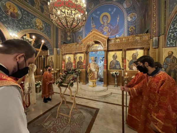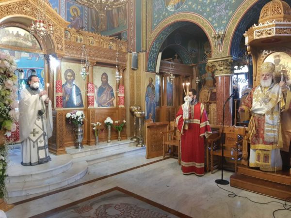 Το πρωί της Δευτέρας της Διακαινησίμου, ο ιεράρχης τέλεσε την Θεία Λειτουργία και ευχήθηκε στους πιστούς της ενορίας, αλλά και στους εορτάζοντες επί τη μνήμη του αγίου Γεωργίου του τροπαιοφόρου, ενώ εμνήσθη του κατά σάρκα πατέρα του Γεωργίου και του αρχιεπισκόπου Αθηνών Χριστόδουλου, ο οποίος τον είχε χειροτονήσει διάκονο την ημέρα μνήμης του Αγίου Γεωργίου.
