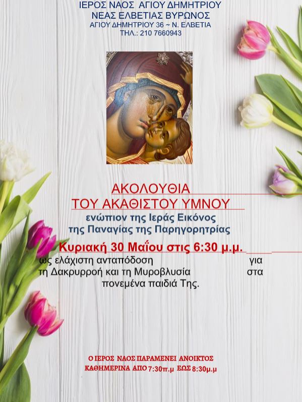 Ως ελάχιστη ανταπόδοση για τη Δακρυρροή και τη Μυροβλυσία στα πονεμένα παιδιά Της, η Ακολουθία του Ακαθίστου Ύμνου θα τελεστεί ενώπιων της Ιεράς Εικόνας της Παναγίας της Παρηγορητρίας την Κυριακή 30 Μαΐου 2021 στις 6:30 μ.μ. στον Ιερό Ναό Αγίου Δημητρίου Νέας Ελβετίας Βύρωνος.