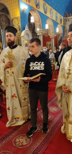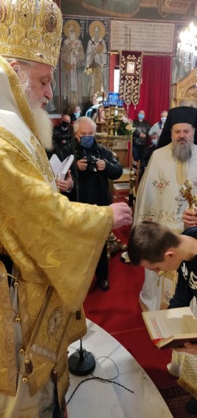 Στο τέλος της Θείας Λειτουργίας, ο Θεοφιλέστατος, με παραίνεση των εφημεριών του Ιερού Ναού, προέβη στη Χειροθεσία Αναγνώστου του Ιεροπαίδος Νικολάου.