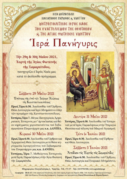 Στις 29 & 30 Μαΐου 2021, Κυριακή της Σαμαρείτιδος, πανηγυρίζει ο Ιερός Ναός του Ευαγγελισμού της Θεοτόκου και της Αγίας Φωτεινής Υμηττού επί τη εορτή της Αγίας Ενδόξου Μεγαλομάρτυρος και Ισαποστόλου Φωτεινής της Σαμαρείτιδος κατά το ακόλουθο πρόγραμμα: