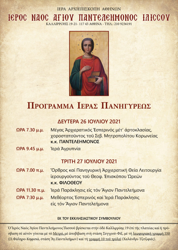Πρόγραμμα της εορτής του Ι.Ν. Αγίου Παντελεήμονος Ιλισσού