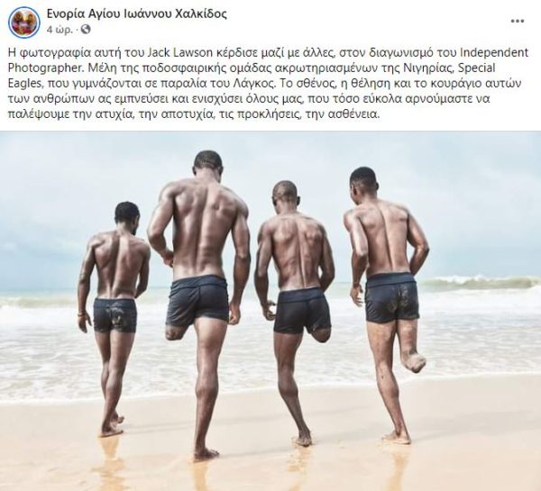 Η φωτογραφία αυτή του Jack Lawson διακρίθηκε μαζί με άλλες, στον διαγωνισμό του Independent Photographer. Μέλη της ποδοσφαιρικής ομάδας ακρωτηριασμένων της Νιγηρίας, Special Eagles, που γυμνάζονται σε παραλία του Λάγκος. “Το σθένος, η θέληση και το κουράγιο αυτών των ανθρώπων, ας εμπνεύσει και ενισχύσει όλους μας, που τόσο εύκολα αρνούμαστε να παλέψουμε την ατυχία, την αποτυχία, τις προκλήσεις, την ασθένεια” αναφέρει η Ενορία Αγίου Ιωάννου Χαλκίδος σε επίκαιρη ανάρτησή της.