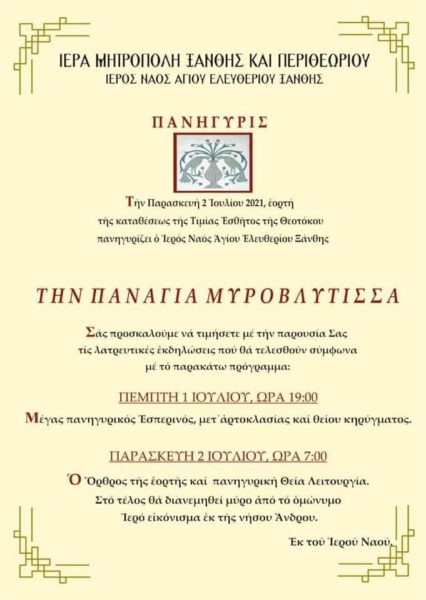 Αύριο, Παρασκευή 2 Ιουλίου 2021, εορτή της Καταθέσεως της Τιμίας Εσθήτος της Θεοτόκου, ο Ιερός Ναός Αγίου Ελευθερίου Ξάνθης πανηγυρίζει την Παναγία τη Μυροβλύτισσα. Ο ιερός ναός προσκαλεί τους πιστούς να τιμήσουν με την παρουσία τους τις λατρευτικές εκδηλώσεις που θα τελεσθούν, αρχής γενομένης από σήμερα, Πέμπτη 1η Ιουλίου, στις 19:00, οπότε και θα ψαλεί ο Μέγας πανηγυρικός Εσπερινός μετ’ αρτοκλασίας και θείου κηρύγματος.