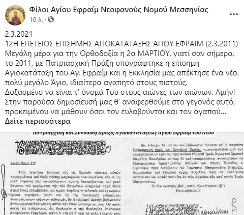 Μεγάλη μέρα για την Ορθοδοξία η 2α ΜΑΡΤΙΟΥ, γιατί σαν σήμερα, το 2011, με Πατριαρχική Πράξη υπογράφτηκε η επίσημη Αγιοκατάταξη του Αγίου Εφραίμ του Όρους των Αμώμων (Νέας Μάκρης) και η Εκκλησία μας απέκτησε ένα νέο, πολύ μεγάλο Άγιο, ιδιαίτερα αγαπητό στους πιστούς παγκοσμίως.