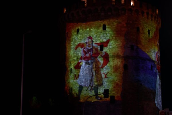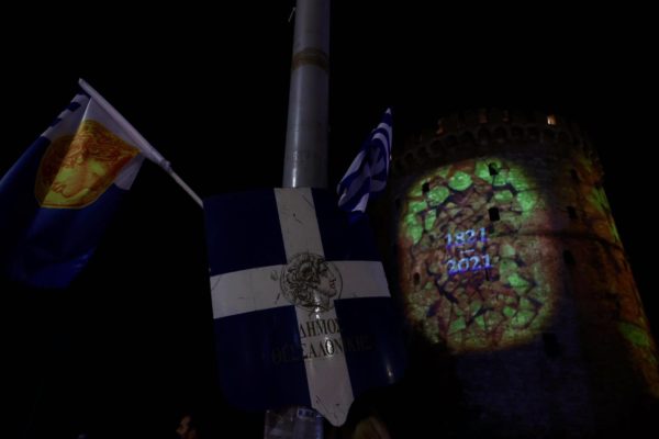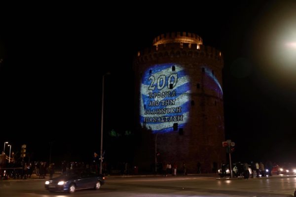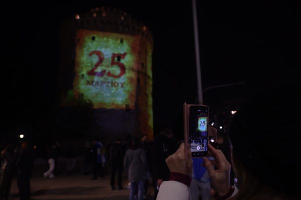 Στα χρώματα της Ελλάδας και με τα μηνύματα της Ελληνικής Επανάστασης του 1821 φωταγωγήθηκε την εσπέρα της 25ης Μαρτίου, ο Λευκός Πύργος, παρουσία του δημάρχου Θεσσαλονίκης Κωνσταντίνου Ζέρβα και πλήθους κόσμου.