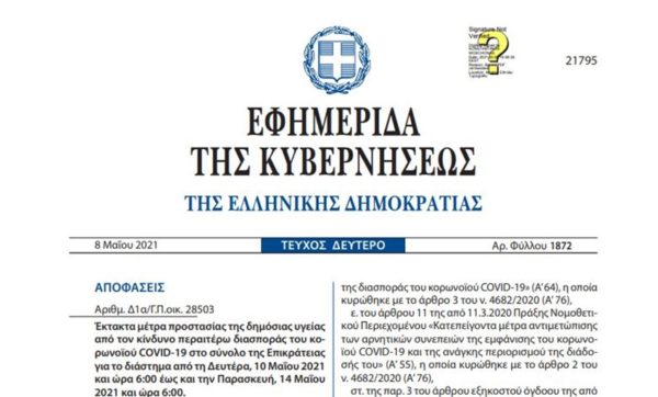 Εκθόθηκε το ΦΕΚ της 8ης Μαϊου, αριθ. φ. 1872, “Έκτακτα μέτρα προστασίας της δημόσιας υγείας από τον κίνδυνο περαιτέρω διασποράς του κορωνοϊού COVID-19 στο σύνολο της Επικράτειας για το διάστημα από τη Δευτέρα, 10 Μαΐου 2021 και ώρα 6:00 έως και την Παρασκευή, 14 Μαΐου 2021 και ώρα 6:00”.