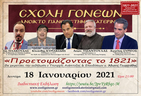 Συνεχίζοντας το αφιέρωμά της για τα 200 χρόνια από την Ελληνική Επανάσταση, η Σχολή Γονέων – Ανοικτό Πανεπιστήμιο Κατερίνης είχε τη χαρά να φιλοξενήσει τη Δευτέρα 18-1-2021 διαδικτυακώς 5 ομιλητές, 2 από τα Ηνωμένα Αραβικά Εμιράτα και 3 από την Αθήνα οι οποίοι ανέπτυξαν το θέμα: «Προετοιμάζοντας το 1821».