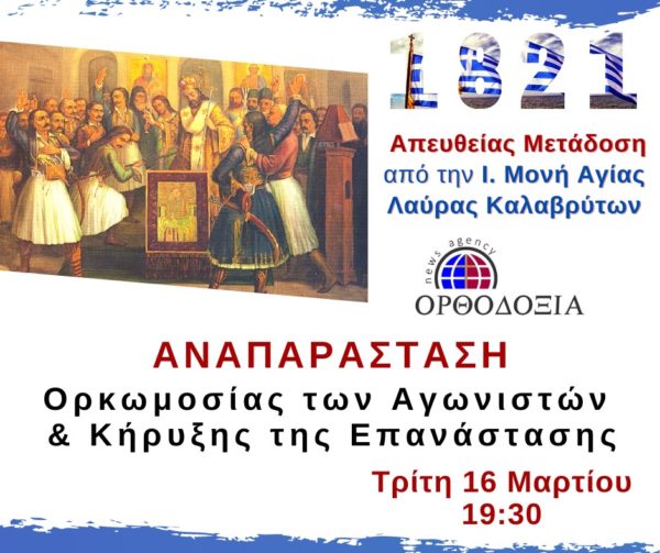 Δείτε σε απευθείας σύνδεση την αναπαράσταση της ορκωμοσίας των αγωνιστών για την κήρυξη της Επανάστασης του 1821 από το διαδικτυακό περιοδικό Πεμπτουσία (www.pemptousia.gr) και το Διεθνές Πρακτορείο Ορθοδοξία (www.ope.gr) την Τρίτη 16 Μαρτίου 2021 στις 19:30.