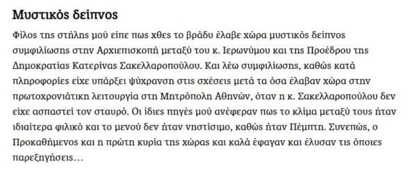 “Φίλος της στήλης μού είπε πως χθες το βράδυ έλαβε χώρα μυστικός δείπνος συμφιλίωσης στην Αρχιεπισκοπή μεταξύ του κ. Ιερωνύμου και της Προέδρου της Δημοκρατίας Κατερίνας Σακελλαροπούλου. Και λέω συμφιλίωσης, καθώς κατά πληροφορίες είχε υπάρξει ψύχρανση στις σχέσεις μετά τα όσα έλαβαν χώρα στην πρωτοχρονιάτικη λειτουργία στη Μητρόπολη Αθηνών, όταν η κ. Σακελλαροπούλου δεν είχε ασπαστεί τον σταυρό. Οι ίδιες πηγές μού ανέφεραν πως το κλίμα μεταξύ τους ήταν ιδιαίτερα φιλικό και το μενού δεν ήταν νηστίσιμο, καθώς ήταν Πέμπτη. Συνεπώς, ο Προκαθήμενος και η πρώτη κυρία της χώρας και καλά έφαγαν και έλυσαν τις όποιες παρεξηγήσεις…”.