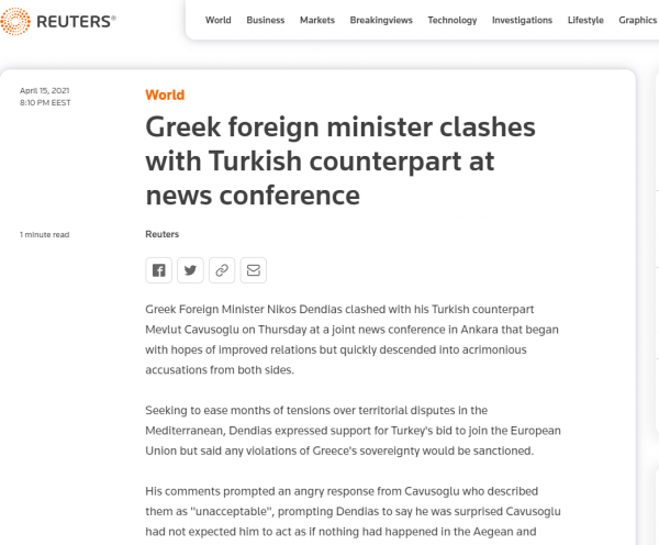 «Ο έλληνας υπουργός Εξωτερικών συγκρούεται με τον τούρκο ομόλογό του σε συνέντευξη Τύπου» έγραψε το διεθνές ειδησεογραφικό πρακτορείο Reuters.