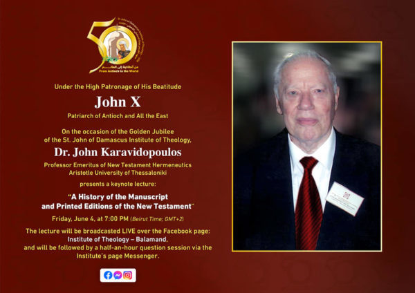 Στη Θεολογική Σχολή του Μπαλαμάντ με αφορμή τον εορτασμό του Χρυσού Ιωβηλαίου θα πραγματοποιηθεί την Παρασκευή διάλεξη του Καθηγητή Ι. Καραβιδόπουλου στις 19:00 ώρα Βηρρυτού.