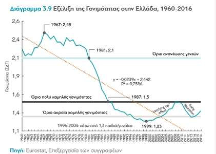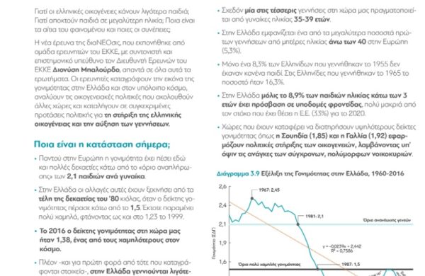 Είναι προφανές ότι οι επιπτώσεις αυτής της εξέλιξης θα είναι καταλυτικές σε μια σειρά από ζητήματα όπως η γεωπολιτική θέση της χώρας, οι αναπτυξιακές της δυνατότητες, η βιωσιμότητα του ασφαλιστικού, η ισορροπία μεταξύ των γενεών. Εξίσου προφανής είναι η συνθετότητα του δημογραφικού μας προβλήματος. Δεν είναι ότι οι Έλληνες δεν θέλουν παιδιά, ότι αργούν να ενηλικιωθούν και να αναλάβουν ευθύνες, ότι τους αποτρέπουν οι δυσχερείς οικονομικές συνθήκες. Και μεταπολεμικά ήταν δύσκολες οι συνθήκες. Όμως τότε δεν επικρατούσε το σημερινό κλίμα αβεβαιότητας, ανασφάλειας, αποθάρρυνσης. Τότε υπήρχε ελπίδα. Σήμερα οι νέοι μας φοβούνται το αύριο, δεν το αντιμετωπίζουν με αισιοδοξία, με τη φυσική ορμή της ηλικίας τους. Φοβούνται ότι θα ζήσουν χειρότερα από τους γονείς τους. Δεν εμπιστεύονται το οικονομικό σύστημα, ανησυχούν για την κατάσταση του πλανήτη και την κλιματική αλλαγή. Το κάποτε ρητορικό ερώτημα «Σε τι κόσμο θα φέρω τα παιδιά μου;» έχει σήμερα ρεαλιστική, άκρως ανησυχητική βάση. Ειδικότερα οι νέες γυναίκες διαπιστώνουν ότι η παραμονή και η ανέλιξή τους στην αγορά εργασίας δε διασφαλίζεται πλήρως μετά την τεκνοποιία. Ακόμη κι όταν καταφέρνουν να διατηρήσουν την εργασία τους και να προχωρήσουν, οι νέες μητέρες εξακολουθούν να επωμίζονται ανισομερώς τις οικογενειακές ευθύνες, να δυσκολεύονται να εναρμονίσουν οικογενειακή και επαγγελματική ζωή και, πολύ συχνά, ιδίως οι μητέρες μονογονεϊκών οικογενειών, να αισθάνονται μόνες, χωρίς καμιά προνοιακή στήριξη».