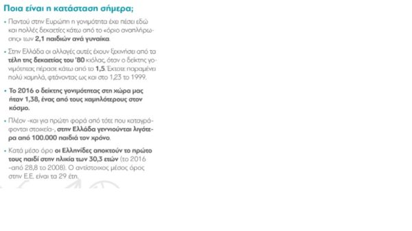 «Ο πληθυσμός της Ελλάδας μειώνεται. Ο πληθυσμός της Ελλάδας γερνάει. Από το 2011, όπως αποδεικνύουν σχετικές έρευνες, η χώρα μας έχει μπει σε μια νέα φάση, πρωτοφανή στα μεταπολεμικά χρόνια. Οι θάνατοι είναι περισσότεροι από τις γεννήσεις. Από την αρχή της οικονομικής κρίσης πολλοί Έλληνες, ιδίως νέοι, εγκαταλείπουν τη χώρα αναζητώντας καλύτερη τύχη στο εξωτερικό. Η ικμάδα του έθνους αποξηραίνεται. Η γήρανση του πληθυσμού, με δεδομένη τη ραγδαία αύξηση του προσδόκιμου της ζωής, είναι ολοφάνερη. Το αποδεικνύουν οι αριθμοί: το 1961 μόλις το 8,3% του πληθυσμού ήταν γηραιότερο των 65 ετών, ενώ το 26,2% ήταν νεότερο των 14 ετών. Το 2020 η σύνθεση του πληθυσμού ήταν εντελώς διαφορετική: το 22,3 % ήταν άνω των 65 ετών, και μόλις το 14,2% κάτω των δεκατεσσάρων. Σύμφωνα με σχετικά πρόσφατα στοιχεία της Ελληνικής Στατιστικής Αρχής, ο δείκτης γήρανσης, ο λόγος δηλαδή του πληθυσμού ηλικίας άνω των 65 ετών προς τον πληθυσμό ηλικίας 0-14 ετών, ανέρχεται σήμερα σε 156,2. Ένα στοιχείο πολύ αποθαρρυντικό.