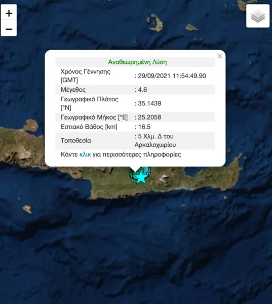 29/09/2021 29/09/2021 Δυο ισχυροί μετασεισμοί εντάσεως 4,6 και 4,3 βαθμών της κλίμακας Ρίχτερ αντίστοιχα ταρακούνησαν το Ηράκλειο Κρήτης πριν από λίγο.  Οι δονήσεις σημειώθηκαν με διαφορά δευτερολέπτων και το επίκεντρό τους εντοπίστηκε πέντε χιλιόμετρα νοτιοδυτικά του Αρκαλοχωρίου. Το εστιακό βάθος ήταν πέντε χιλιόμετρα. Όπως ανακοινώθηκε από το Γεωδυναμικό Ινστιτούτο του Εθνικού Αστεροσκοπείου Αθηνών, οι σεισμοί κατεγράφησαν στις...