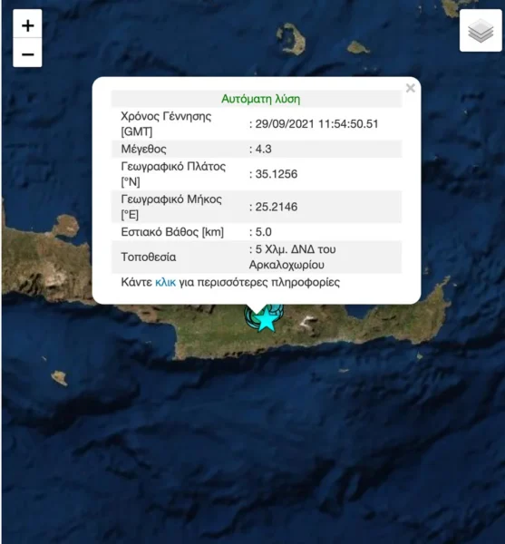 29/09/2021 29/09/2021 Δυο ισχυροί μετασεισμοί εντάσεως 4,6 και 4,3 βαθμών της κλίμακας Ρίχτερ αντίστοιχα ταρακούνησαν το Ηράκλειο Κρήτης πριν από λίγο.  Οι δονήσεις σημειώθηκαν με διαφορά δευτερολέπτων και το επίκεντρό τους εντοπίστηκε πέντε χιλιόμετρα νοτιοδυτικά του Αρκαλοχωρίου. Το εστιακό βάθος ήταν πέντε χιλιόμετρα. Όπως ανακοινώθηκε από το Γεωδυναμικό Ινστιτούτο του Εθνικού Αστεροσκοπείου Αθηνών, οι σεισμοί κατεγράφησαν στις...
