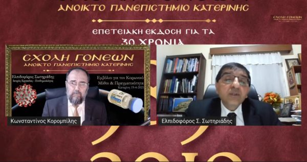 Μια ενδιαφέρουσα προσέγγιση στο ζήτημα της πανδημίας του κορωνοϊού παρουσίασε την Δευτέρα 19 Απριλίου 2021 στη Σχολή Γονέων – Ανοικτό Πανεπιστήμιο Κατερίνης ο προσκεκλημένος Ιατρός Εργασίας και Επιδημιολόγος Δρ. Ελπιδοφόρος Σωτηριάδης με θέμα: «Το εμβόλιο για τον κορωνοϊό … Μύθοι & Πραγματικότητα». Με ανατρεπτική διάθεση και επιστημονική συλλογιστική, αναπτύσσοντας μια εκτεταμένη επιχειρηματολογία, ο κ. Καθηγητής αμφισβήτησε ανοιχτά και ευθέως την ‘‘πολιτική ορθότητα’’ διαφόρων μέτρων ελέγχου και προσεγγίσεων τα οποία ζήσαμε στα αλλεπάλληλα «κύματα» της τρέχουσας πανδημίας, αρκετά από τα οποία έχουν παγιωθεί και τελικά εφαρμόστηκαν ως «συστημικό πλέγμα μέτρων» από τις περισσότερες κυβερνήσεις του πλανήτη.
