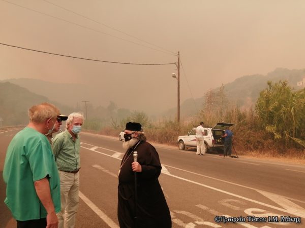 Στη συνέχεια κατευθύνθηκε προς τον κόμβο της Μαραθέας Γυθείου, όπου μηχανήματα του Δήμου δημιουργούν αντιπυρική ζώνη ώστε να ανακοπεί η πορεία της πυρκαγιάς. Εκεί συνομίλησε και εμψύχωσε πνευματικά τους πυροσβέστες και τους εθελοντές, που επιχειρούν για την κατάσβεση της πυρκαγιάς. Παράλληλα είχε ενημέρωση από εκπροσώπους των τοπικών αρχών για την διαχείριση της κατάστασης έκτακτης ανάγκης στην οποία έχει περιέλθει η Μάνη.