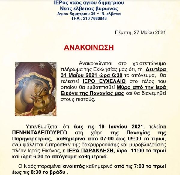Στον Ιερό Ναό Αγίου Δημητρίου Νέας Ελβετίας Βύρωνος τη Δευτέρα 31 Μαΐου 2021 στις 6:30 το απόγευμα θα τελεστεί το Ιερό Ευχέλαιο στο τέλος του οποίου θα εμβαπτισθεί η Ιερή ευλογία των δακρύων και του μύρου της Κυρίας Θεοτόκου εις ίασιν σωμάτων και ψυχών και ανάνηψη από τον κόπο που προκάλεσε η πανδημία στην πανανθρώπινη κοινωνία.