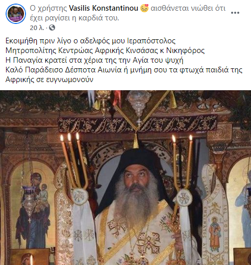 «Απόψε το Δευτερόθρονο Πατριαρχείο μας είναι πολύ πτωχότερο. Ο αδελφός μας, Σεβασμ. Μητροπολίτης Κινσάσας κυρός Νικηφόρος «έφυγε» για την Βασιλεία του Θεού, νικημένος από covid. Η λύπη του Μακαριωτάτου Προκαθημένου μας και όλων των αδελφών στην Ιερά Σύνοδο είναι βαθύτατη. Η πανδημία μάς στέρησε ένα πολυτιμότατο στέλεχος, έναν αγιώτατο μοναχό και ιεραπόστολο Ιεράρχη. Καλή Ανάσταση δεσπότη μας Νικηφόρε! Αναπαύσου στην αγκαλιά του Χριστού που αγάπησες και κήρυξες στην Εκκλησία του Κονγκό! Θα σε μνημονεύουμε πάντοτε!»