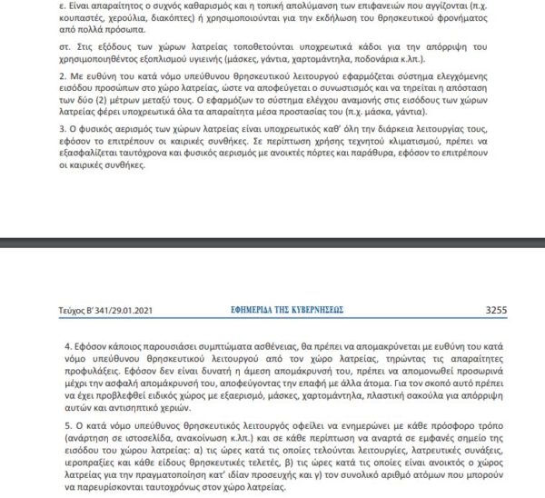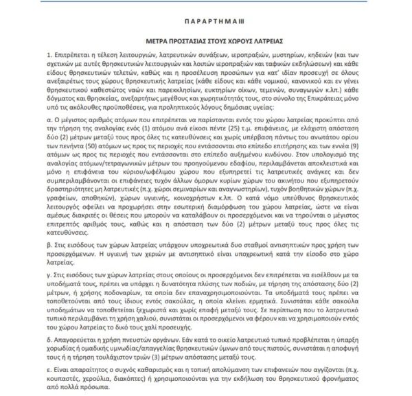 Ενώ ακόμα για την ομαλή λειτουργία των χώρων λατρείας έχει εκδοθεί και το παράρτημα III το οποίο αναφέρει αναλυτικές οδηγίες: