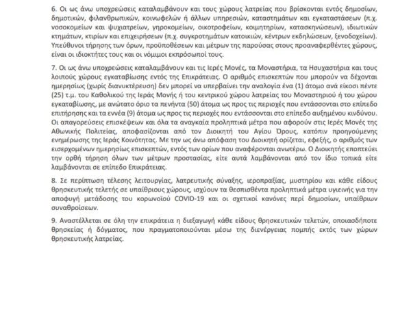 3ο. Στους χώρους λατρείας, επιτρέπονται μέχρι 9 άτομα κατά την τέλεση λειτουργιών.