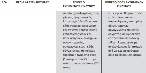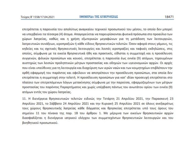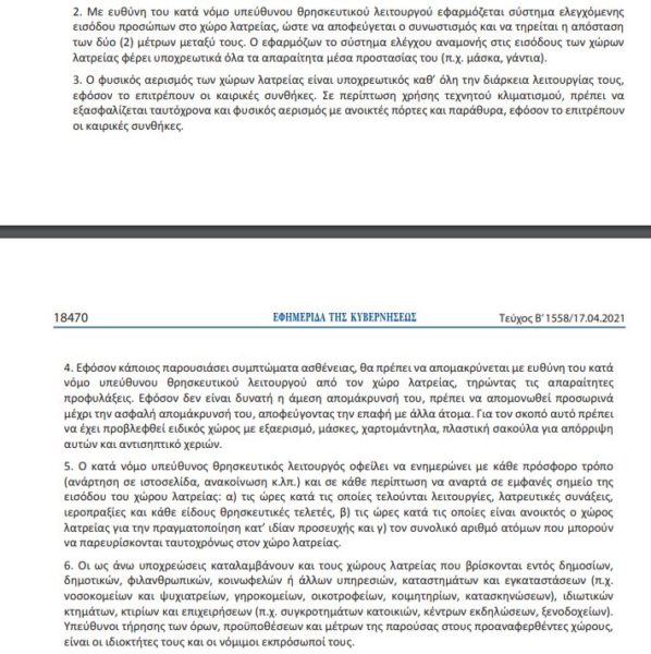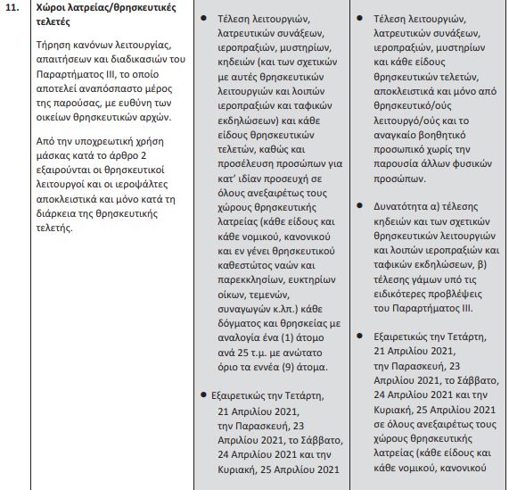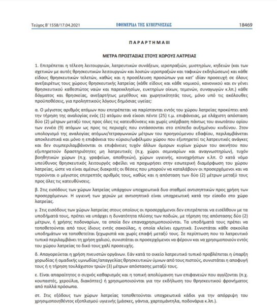 Εκδόθηκε το ΦΕΚ με την Κοινή Υπουργική Απόφαση για τα μέτρα που θα ισχύουν μέχρι τη Μεγάλη Δευτέρα το πρωί. Οι Ιεροί Ναοί όλης της χώρας θα λειτουργούν με περιορισμούς. Συγκεκριμένα κατά τις Ιερές Ακολουθίες της Τετάρτης 21 Απριλίου, Παρασκευής 23 Απριλίου, του Σαββάτου του Λαζάρου 24 Απριλίου και την Κυριακή των Βαΐων 25 Απριλίου, οι πιστοί θα μπορούν να λειτουργηθούν με την αναλογία 1 ατόμου ανά 25 τ.μ. και ανώτατο όριο τα 20 άτομα.