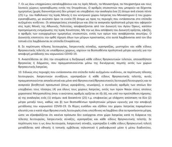 Ακόμα υπάρχει σχετικό παράρτημα στο οποίο αναφέρονται ρητές οδηγίες που πρέπει να τηρηθούν κατά τις Ακολουθίες τόσο από τους Ιερείς όσο και από τους πιστούς ενώ ο κάθε Ναός πρέπει να φροντίζει για τον αερισμό και την παροχή αντισηπτικού. Ταυτόχρονα διευκρινίζεται ότι στις Ιερές Μονές και τα Ησυχαστήρια δεν επιτρέπεται η διανυκτέρευση των επισκεπτών ούτε και η ταυτόχρονη παρουσία εντός του Καθολικού των Μοναστηριών άνω των 9 ατόμων με την αναλογία 1 άτομο ανά 25 τ.μ. ενώ για την Αθωνική Πολιτεία τα μέτρα τα καθορίζει η Διοίκηση του Αγίου Όρους σε συνεννόηση με την Ιερά Κοινότητα.