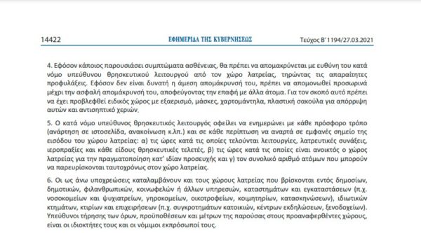 Σε περίπτωση μη τήρησης των μέτρων προβλέπεται πρόστιμο 1.5οο ευρώ στον θρησκευτικό λειτουργό: