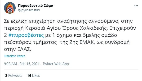 Με ανάρτησή του το Πυροσβεστικό Σώμα ενημέρωσε για επιχείρηση για τον εντοπισμό ενός αγνοουμένου στο Άγιον Όρος της Χαλκιδικής.