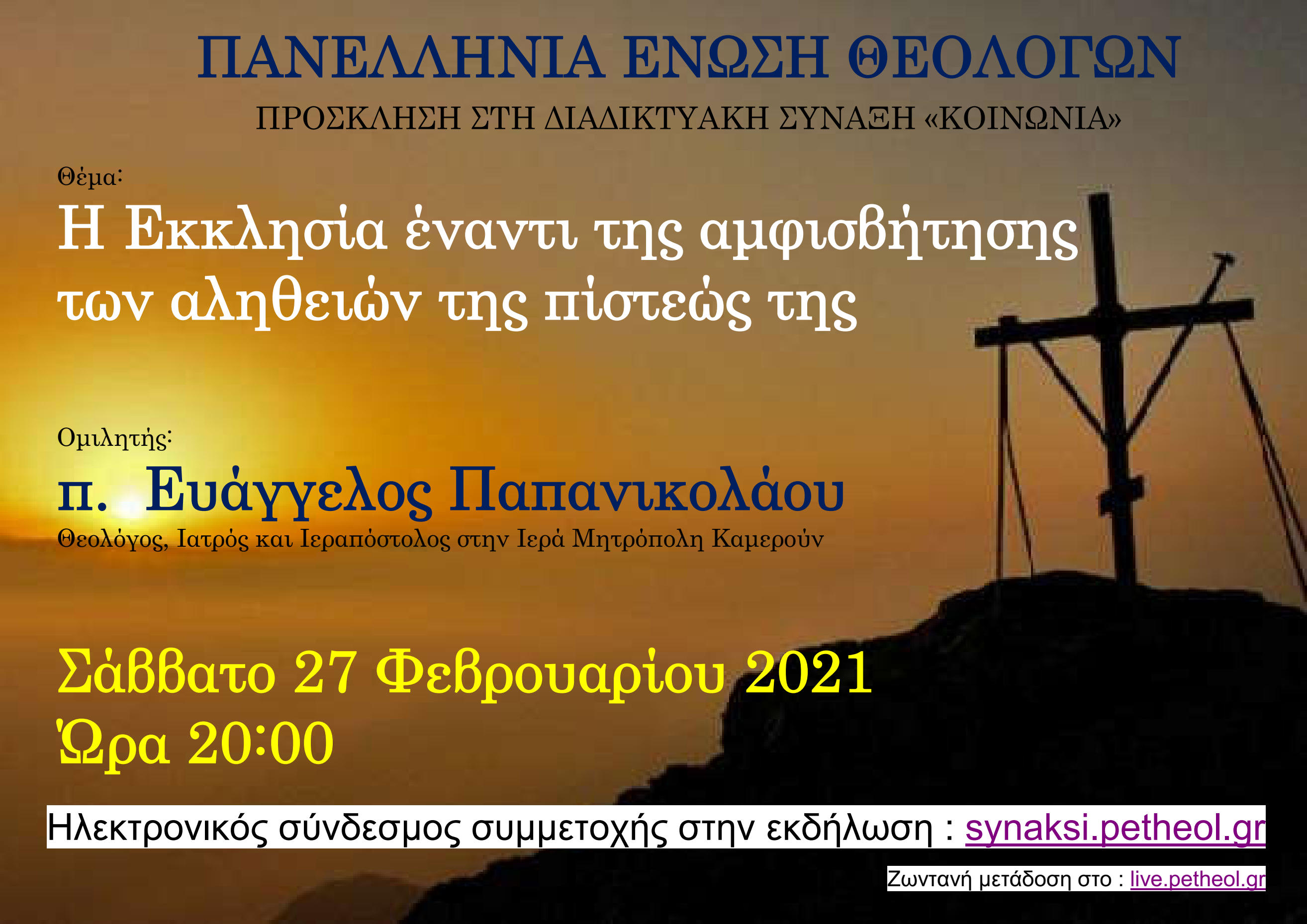Διαδικτυακή σύναξη με θέμα “Η Εκκλησία έναντι της αμφισβήτησης των αληθειών της πίστεώς της” διοργανώνει η Πανελλήνια Ένωση Θεολόγων.