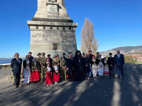 Παρέστησαν η Κυβερνήτρια της Τασμανίας, κ. Kate Warner, η Γενική Εισαγγελέας και Υπουργός Δικαιοσύνης κ. Elise Archer, βουλευτές από τη νησιωτική πολιτεία της Αυστραλίας, καθώς και ο Πρόεδρος της Κρητικής Ομοσπονδίας Αυστραλίας και Νέας Ζηλανδίας, κ. Αντώνης Τσουρδαλάκης. Μετά από το Τρισάγιο, πραγματοποιήθηκε κατάθεση στεφάνων. Ο π. Πρόχορος, Αρχιερατικός Επίτροπος Καμπέρας και Τασμανίας, κατέθεσε στεφάνι στο Μνημείο εκ μέρους της Ιεράς Αρχιεπισκοπής Αυστραλίας και του Σεβασμιωτάτου κ. Μακαρίου.