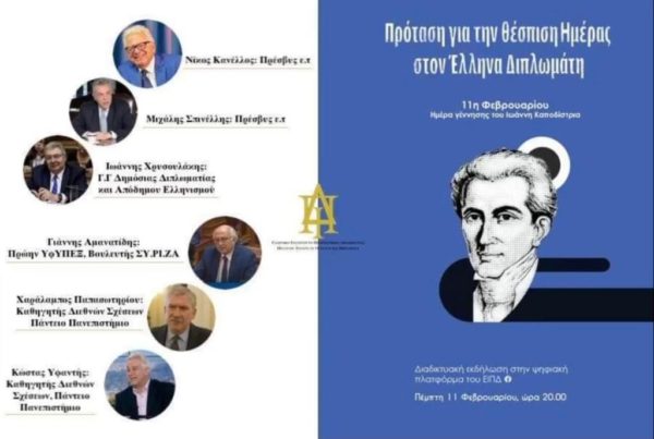Ο Γενικός Γραμματέας Δημόσιας Διπλωματίας και Απόδημου Ελληνισμού του Υπουργείου Εξωτερικών Γ. Χρυσουλάκης συμμετείχε με χαιρετισμό του στη διαδικτυακή συζήτηση που διοργάνωσε το Ελληνικό Ινστιτούτο Πολιτιστικής Διπλωματίας (ΕΙΠΔ) με αφορμή την ημέρα γέννησης του Ιωάννη Καποδίστρια.