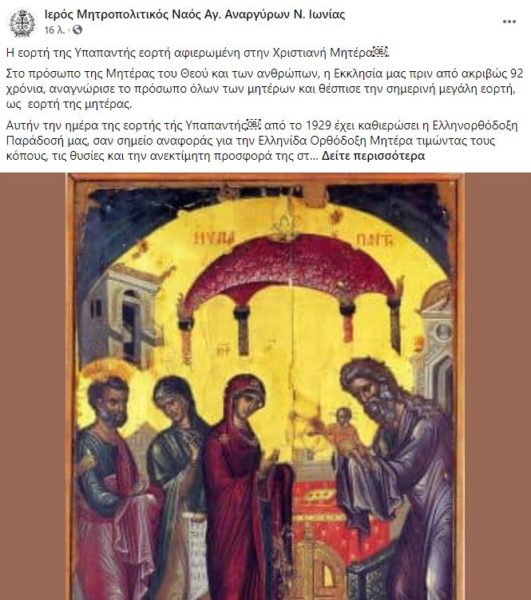 “Η εορτή της Υπαπαντής εορτή αφιερωμένη στην Χριστιανή Μητέρα” όπως ορθώς αναφέρει σε επίκαιρη ανάρτησή του, ο Ιερός Μητροπολιτικός Ναός Αγ. Αναργύρων Ν. Ιωνίας.