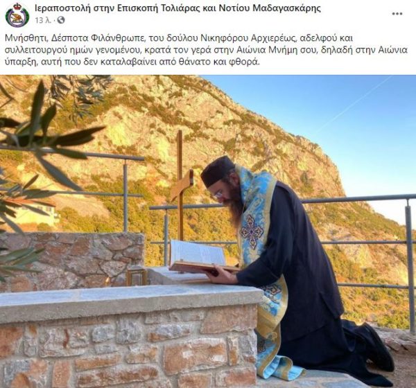 “Μνήσθητι, Δέσποτα Φιλάνθρωπε, του δούλου Νικηφόρου Αρχιερέως, αδελφού και συλλειτουργού ημών γενομένου, κρατά τον γερά στην Αιώνια Μνήμη σου, δηλαδή στην Αιώνια ύπαρξη, αυτή που δεν καταλαβαίνει από θάνατο και φθορά” αναφέρει και εύχεται σε επίκαιρή ανάρτησή του, ο Θεοφιλέστατος Επίσκοπος Τολιάρας και Νοτίου Μαδαγασκάρης κ. Πρόδρομος.