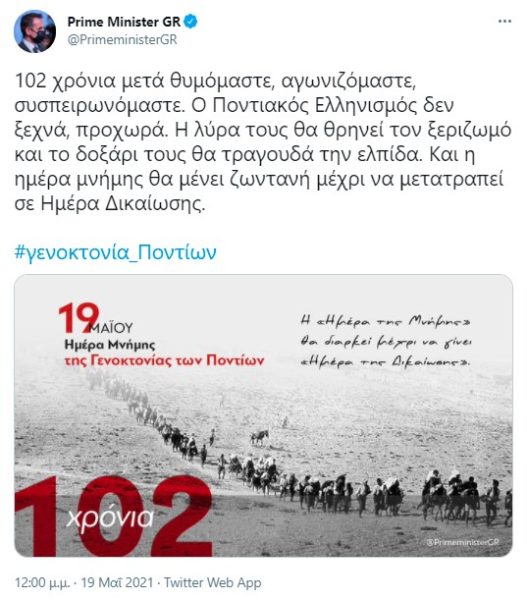 “102 χρόνια μετά θυμόμαστε, αγωνιζόμαστε, συσπειρωνόμαστε. Ο Ποντιακός Ελληνισμός δεν ξεχνά, προχωρά. Η λύρα τους θα θρηνεί τον ξεριζωμό και το δοξάρι τους θα τραγουδά την ελπίδα. Και η ημέρα μνήμης θα μένει ζωντανή μέχρι να μετατραπεί σε Ημέρα Δικαίωσης” αναφέρει στο μήνυμα του ο πρωθυπουργός της χώρας κ. Κυριάκος Μητσοτάκης για την Γενοκτονία των Ποντίων.