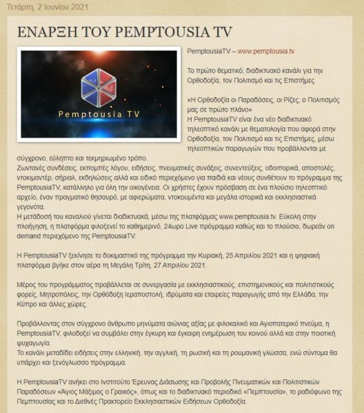 Στην έναρξη της λειτουργίας του ψηφιακού καναλιού PEMPTOUSIATV αναφέρεται το επίσημο ιστολόγιο της Ιεράς Μητροπόλεως Εδέσσης, Πέλλης και Αλμωπίας σε επίκαιρη ανάρτησή του, την Τετάρτη 2 Ιουνίου, ενθαρρύνοντας το ευσεβές τοπικό πλήρωμα στην παρακολούθηση της ροής του ζωντανού προγράμματος αλλά και του επισήμου τρέιλερ του καναλιού.