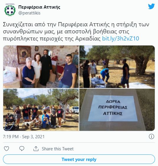 «Συνεχίζουμε να συμβάλλουμε στην τεράστια προσπάθεια που καταβάλουν οι συνάνθρωποί μας να ξεπεράσουν τις συνέπειες των καταστροφικών πυρκαγιών» επισήμανε ο περιφερειάρχης Αττικής, Γ. Πατούλης με αφορμή την βοήθεια αλληλεγγύης προς τους πληγέντες από τις καταστροφικές πυρκαγιές στην Αρκαδία.