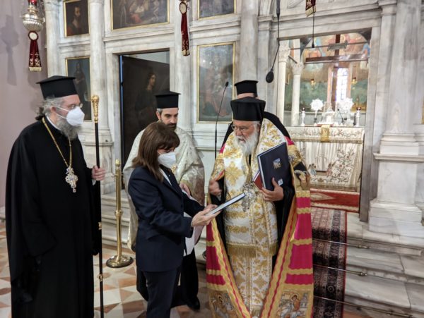Εκτός από την εικόνα του Αγίου Σπυρίδωνος, ο Σεβασμιώτατος κ. Νεκτάριος προσέφερε στην κ. Πρόεδρο και τα λευκώματα των εκδόσεων της Ιεράς Μητροπόλεως για τον Άγιο Σπυρίδωνα, τα μοναστήρια της Κέρκυρας και το Πάσχα στην Κέρκυρα.