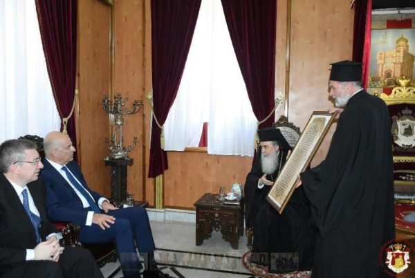 Με τον Μακαριώτατο Πατριάρχη Ιεροσολύμων κ.κ. Θεόφιλο συναντήθηκε την Τρίτη ο υπουργός Εξωτερικών Νίκος Δένδιας στα Ιεροσόλυμα στο πλαίσιο της επίσκεψης του στην ευρύτερη περιοχή της Μέσης Ανατολής.