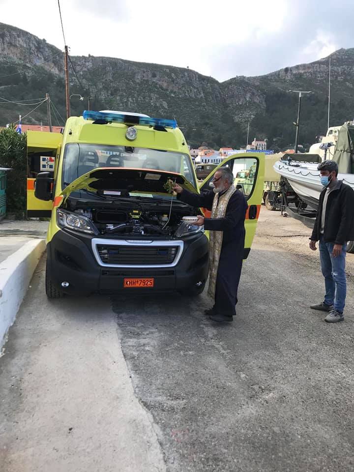 Ο παπά Γιώργης από το Καστελόριζο ευλογεί το νέο ασθενοφόρο που έφθασε στο ακριτικό νησί, εκφράζοντας παράλληλα την ευγνωμοσύνη του. Σε ανάρτησή του στα μέσα κοινωνικής δικτύωσης αναφέρει: