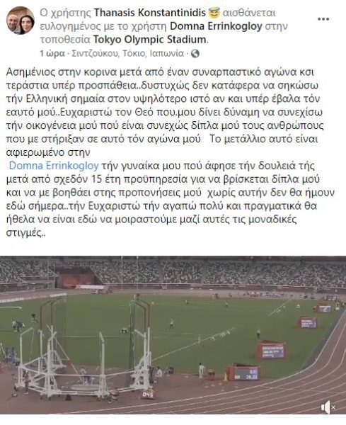 ΤΟΚΙΟ – “Ασημένιος στην κορίνα μετά από έναν συναρπαστικό αγώνα και τεράστια υπερπροσπάθεια. Δυστυχώς, δεν κατάφερα να σηκώσω τήν Ελληνική σημαία στον υψηλότερο ιστό, αν και υπερέβαλα τον εαυτό μού” αναφέρει ο ασημένιος Παραολυμπιονίκης Θανάσης Κωνσταντινίδης σε επίκαιρη ανάρτησή του. “Ευχαριστώ τον Θεό που μου δίνει δύναμη να συνεχίσω, την οικογένειά μου πού είναι συνεχώς δίπλα μου, τους ανθρώπους που με στήριξαν σε αυτόν τον αγώνα μού. Το μετάλλιο αυτό είναι αφιερωμένο στην γυναίκα μου πού άφησε την δουλειά τής μετά από σχεδόν 15 έτη προϋπηρεσίας για να βρίσκεται δίπλα μου και να με βοηθάει στης προπονήσεις μού, χωρίς αυτήν δεν θα ήμουν εδώ σήμερα. Την ευχαριστώ, την αγαπώ πολύ και πραγματικά θα ήθελα να είναι εδώ, να μοιραστούμε μαζί αυτές τις μοναδικές στιγμές”.