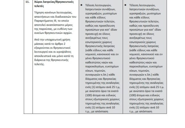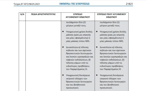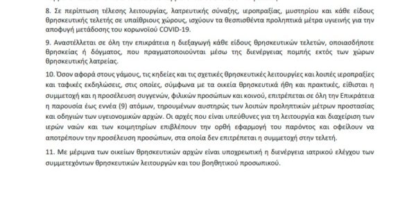 “Όσον αφορά στους γάμους, τις κηδείες και τις σχετικές θρησκευτικές λειτουργίες και λοιπές Ιεροπραξίες και ταφικές εκδηλώσεις, στις οποίες, σύμφωνα με τα οικεία θρησκευτικά ήθη και πρακτικές, είθισται η συμμετοχή και η προσέλευση συγγενών, φιλικών προσώπων και κοινού, επιτρέπεται σε όλη την Επικράτεια η παρουσία έως εννέα (9) ατόμων, τηρουμένων αυστηρώς των λοιπών προληπτικών μέτρων προστασίας και οδηγιών των υγειονομικών αρχών”.