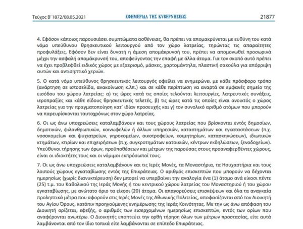 Για τις Ιερές Μονές απαγορεύεται η διανυκτέρευση των επισκεπτών ενώ επιτρέπεται 1 άτομο ανά 25 τ.μ. με ανώτατο όριο τα 20 άτομα σε κάθε Μονή όπως αναφέρει το άρθρο 7 του παραρτήματος. Για το Άγιο Όρος αποφασίζει τα μέτρα ο Πολιτικός Διοικητής σε συνεργασία με την Ιερά Κοινότητα σύμφωνα με την ΚΥΑ.