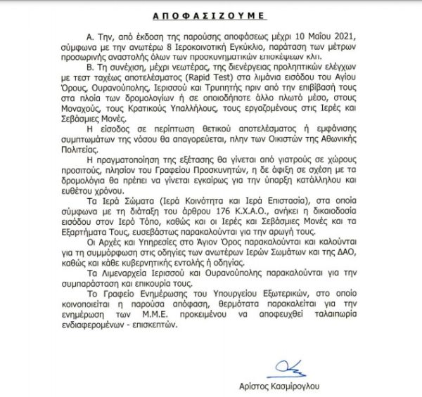 Στο Άγιο Όρος ο Αναπληρωτής Διοικητής κ. Αρίστος Κασμίρογλου έχει υπογράψει την παράταση των μέτρων που προβλέπει την αναστολή όλων των προσκυνηματικών επισκέψεων μέχρι και την αυριανή ημέρα, Δευτέρα 10 Μαΐου 2021, και τα μέτρα που ισχύουν είναι τα κάτωθι: